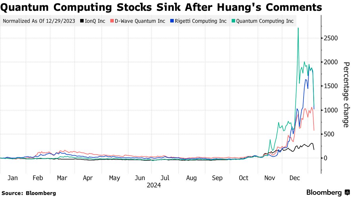 量子计算公司、D-Wave量子公司和Rigetti计算公司的股票下跌超过30%,而IonQ下跌约29%。这些股票在最近几个月因对该技术潜力的兴奋而飙升,上个月在谷歌母公司Alphabet Inc.的突破后,这种兴奋达到了高潮。