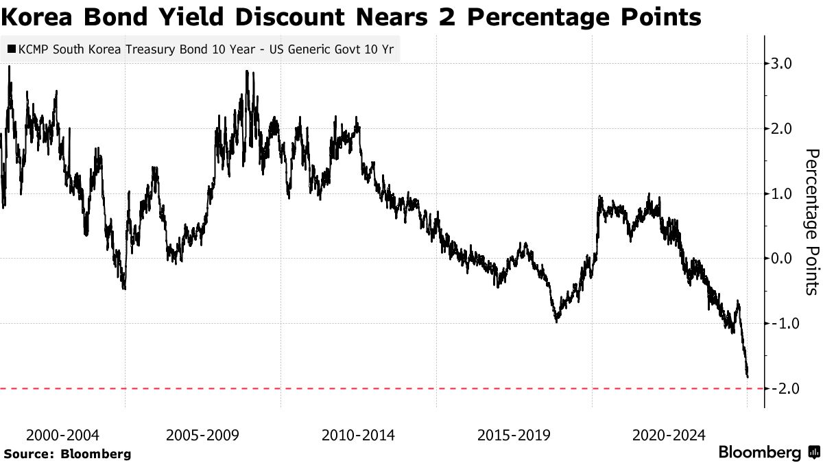 韩国的债券收益率已降至与美国国债相比的一系列历史低点,进一步加大了已经受到 政治危机冲击的韩元的压力。