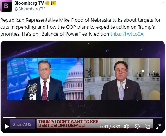 今天在彭博电视台的 权力平衡早间版中,主持人乔·马修和凯莉·莱因兹采访了内布拉斯加州的共和党代表迈克·弗拉德,讨论了共和党削减开支和加快特朗普议程的计划。