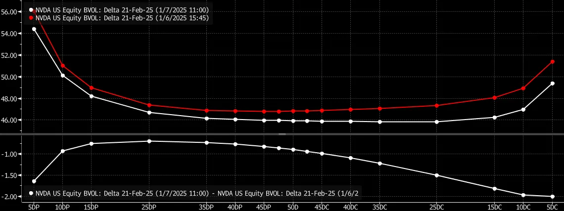 截至纽约时间下午4:23,总期权交易量达到了673万,是自11月21日以来的最高水平。2月期权隐含波动率的变化突显了出售的情况,看涨期权的折扣低于看跌期权,从周一的平价水平下滑。