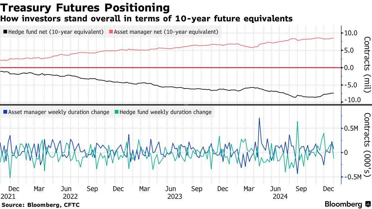 进入年底,对冲基金在国债期货合约中增加了约124,000个10年期票据期货的净空头头寸,而资产管理公司则增加了约72,000个10年期票据期货的净多头头寸。对于对冲基金而言,新增的最大空头风险出现在超长期10年期票据期货中,熊市头寸增加了约$5.9m/DV01,CFTC数据表明。