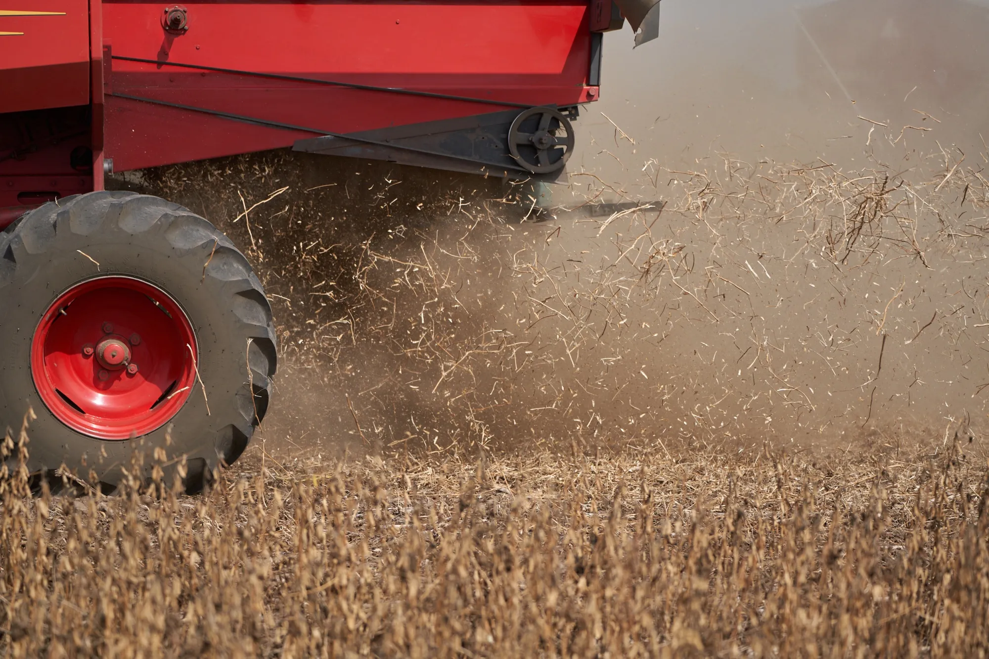 2023年4月,在阿根廷圣荷西德拉埃斯基纳的一处受干旱影响的农场,联合收割机正在大豆田中作业。