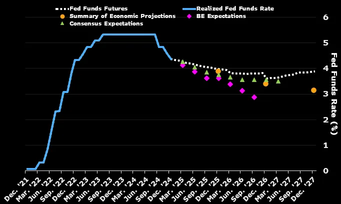 *“在2024年最后一次会议上,公开市场委员会采取了鹰派立场,以仅50个基点的2025年降息预期让市场失望。为了证明这一立场,2025年初的通胀数据由于剩余的季节性因素可能会相对强劲。然而,我们认为美联储在2025年和2026年最终将分别需要降息75个基点,*因为失业率将继续上升,预计到2025年底为4.7%,到2026年底为5.0%。”