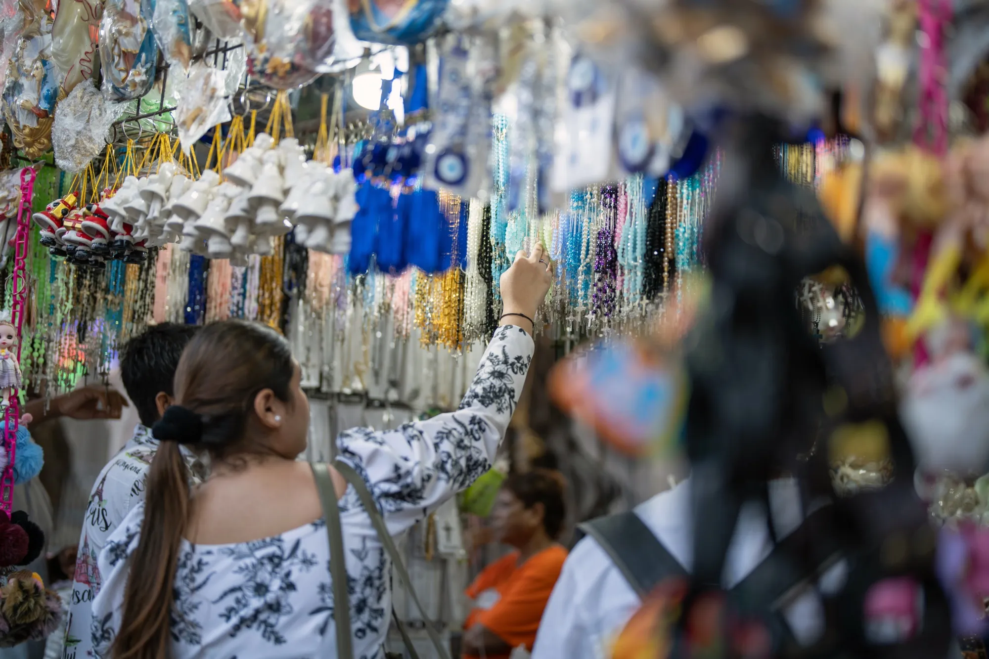 一位女性在印度孟买的班德拉郊区的街边摊位购买小饰品,时间是2025年1月3日,星期五。