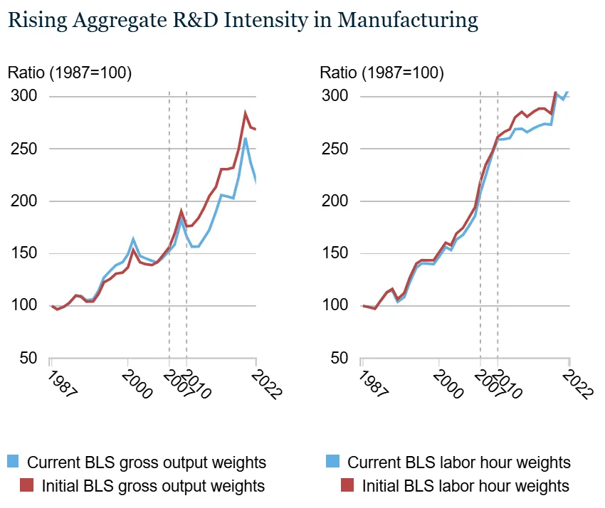 美国制造业的生产力在过去十年左右一直表现平平,但这并不是因为对研究和开发的投资不足。纽约联邦储备银行经济学家的分析显示,研发支出相对于金融危机前的时期有所增加。