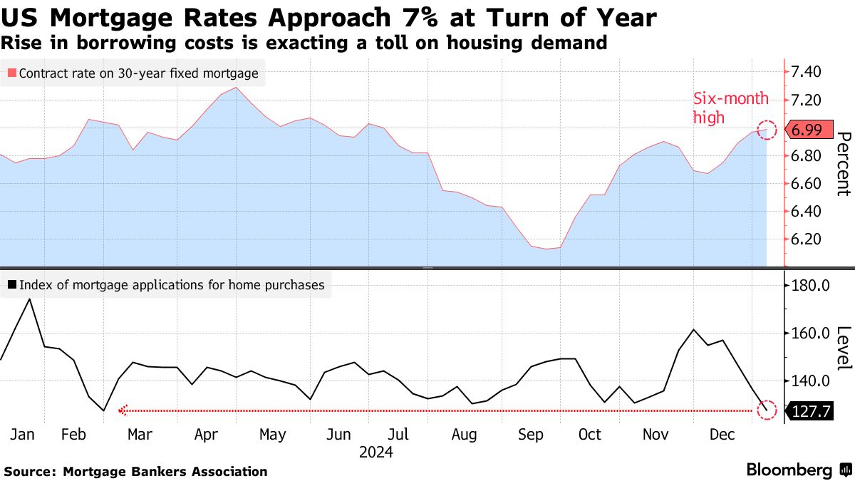 抵押贷款利率跟踪美国国债收益率,后者在新年中 飙升,原因是 强劲的经济数据、美联储减少降息的前景以及对特朗普政府将助长通货膨胀的担忧。 本周国债拍卖的需求疲软,以及大量 企业债务发行,也在推高收益率,并暗示抵押贷款利率将继续上升。
