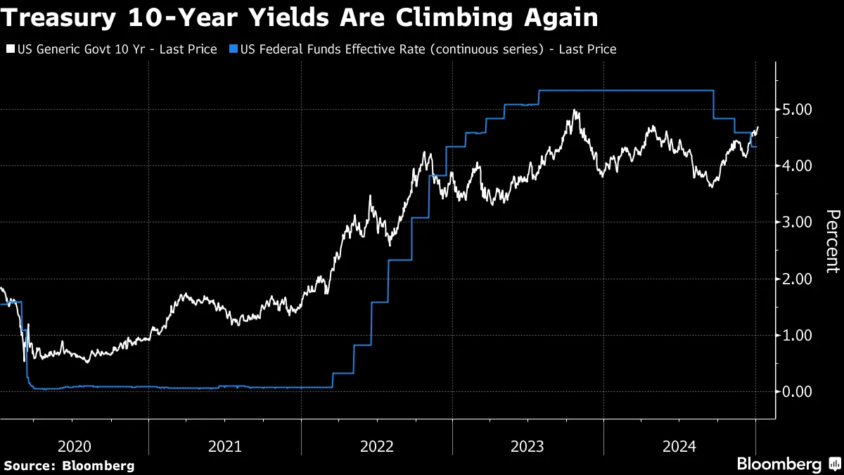 美国基准收益率在周二飙升至约4.70%,相比于9月份的3.60%低点,投资者正在为唐纳德·特朗普第二任期下的通胀政策做准备。经济的韧性促使交易员推迟对美联储下次降息25个基点的预期至7月,这导致对收益率可能上升到何种水平的重新评估。