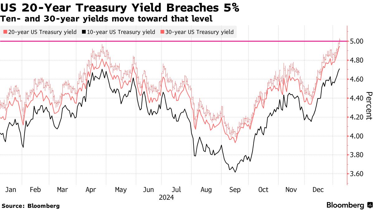 全球债券抛售使美国国债收益率徘徊在5%附近 - 彭博社