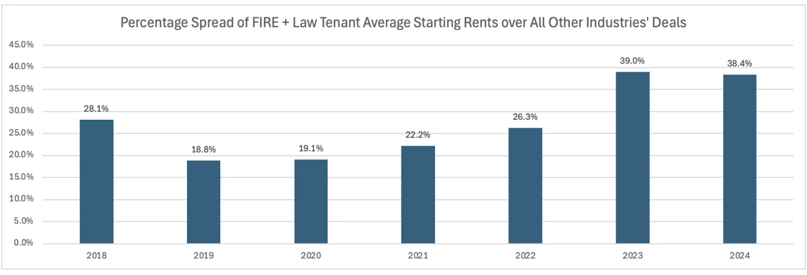 来源:Compstak来源:CompstakFIRE和法律租户与其他租户之间的差距也很明显:根据CompStak的数据,2019年,他们支付的起租溢价比其他行业高出18.8%;到2024年,这一溢价已膨胀至38.4%。