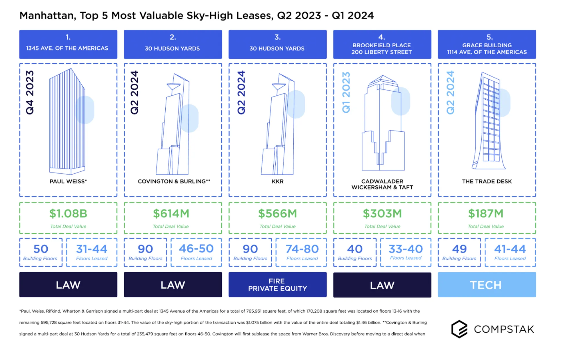 法律行业是曼哈顿另一个主要的租赁驱动因素,白手套律师事务所偏爱美丽的景观,并愿意支付高额租金:保尔·韦斯在美洲大道1345号的14.6亿美元交易中,主要租赁了摩天大楼31至44层的空间,而科文顿与伯林则在30哈德逊园区租赁了46至50层,交易价值超过6亿美元。