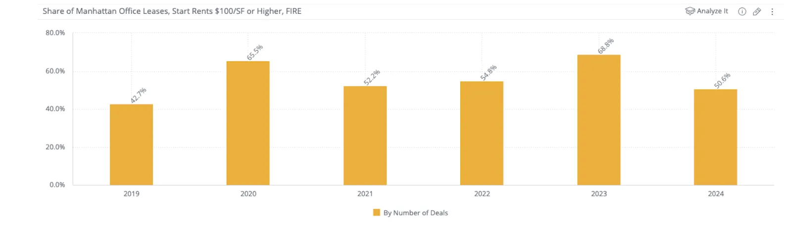 来自这些行业的租户通常主导其办公市场,特别是在高端市场:在过去五年中,他们签署了大部分三位数租约(起租价为每平方英尺100美元或更高),根据CompStak的分析,2023年签署了近69%的此类租约。