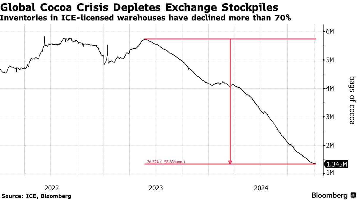 全球可可短缺如此严重,以至于通过纽约交易所交付供应的成本现在远低于在实物市场购买的成本。因此,经过交易所许可的仓库中的库存正在减少,自2023年5月以来下降了超过70%,ICE数据显示。