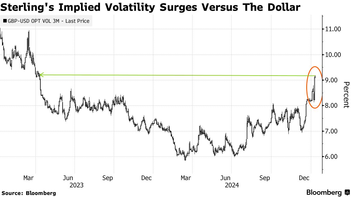 周三英镑一度下跌超过1%,跌至自四月以来的最低点。与英镑上涨相比,未来一周对英镑下行风险的对冲成本激增。三个月隐含波动率,即该时间段内预期波动的衡量标准,飙升至自2023年四月以来的最高水平。