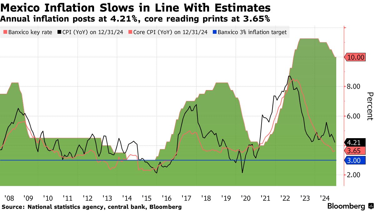 中央银行,通常称为Banxico,将于2月6日召开下次利率决策会议,已表示将会有更多的借贷成本削减,并且“更大幅度的下调可能会被考虑。”本周发布的最新Citi调查预测,2025年国内生产总值仅将增长1%,这可能会导致通货膨胀放缓。