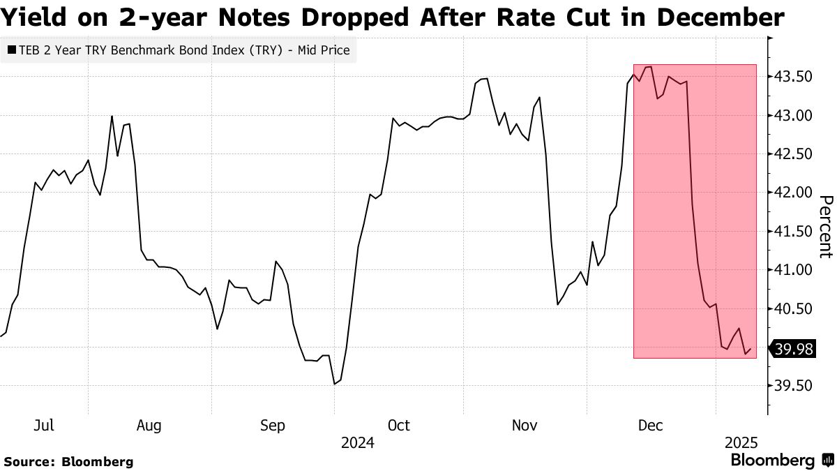 现在他说他更青睐短期的传统固定利率里拉债务,并在中央银行开始降息之前的12月首次购买了这些票据,时隔三年多。这个赌注已经开始见效,周一两年期票据的收益率从中央银行降息前的约43%降至40%以下,而五年期票据则从约35%回落至32%。