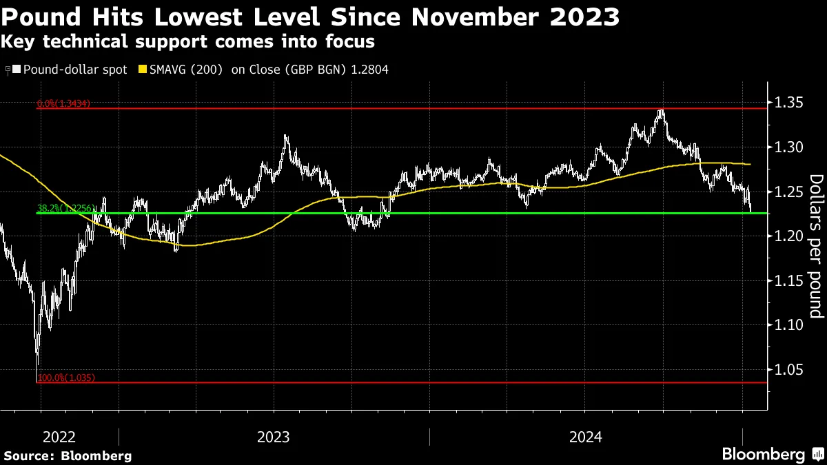 英镑连续第三天下跌,贬值至1%至1.2239美元,为2023年11月以来的最低水平。国债在开盘时大幅下跌,10年期债券收益率上升至13个基点,达到4.92%。FTSE 250指数下跌至1.1%,走向自8月以来最糟糕的三天跌幅。