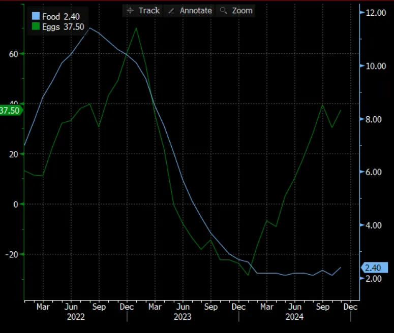 来源:彭博社来源:彭博社当然,鸡蛋可能做成美味的煎蛋卷,但它们本身并不一定会导致显著的通货膨胀激增(或债券抛售)。不过,随着一些其他食品(如牛肉)最近价格也在上涨,家庭食品类别的回升值得关注。鸡蛋的非凡食品通货膨胀时代可能还没有结束。