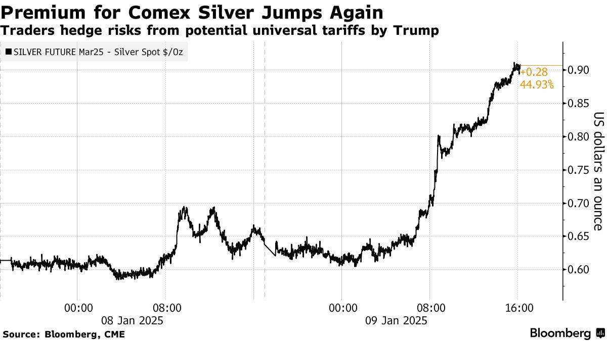 前月Comex银期货交易价格超过伦敦周四设定的现货金属价格每盎司高出0.90美元的溢价,接近12月时的峰值,交易员们对此作出反应,特朗普承诺对来自所有国家的所有商品施加 普遍关税。这将包括中国等主要经济对手以及加拿大和墨西哥等贸易伙伴。