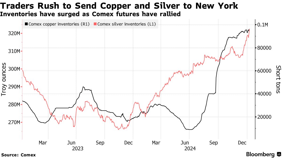 “全球投资者在新年开始时寻求保护,以应对持续和可能上升的通货膨胀、财政债务担忧以及特朗普的不可预测性,”Saxo Bank商品策略负责人Ole Hansen表示。Comex价格的暴涨“无疑是特朗普不可预测性故事的一部分。”