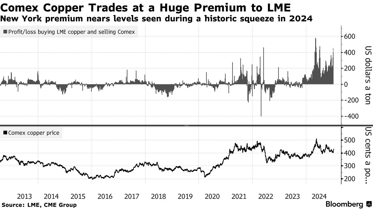 前月的Comex铜也以每吨623美元的溢价交易,超过了在伦敦金属交易所设定的等效期货,接近去年在历史性短缺挤压中看到的记录水平。自去年以来,交易员们一直在急于将铜运入美国仓库,以利用价格飙升的机会,自纽约银价开始上涨以来,类似的努力也在进行中。