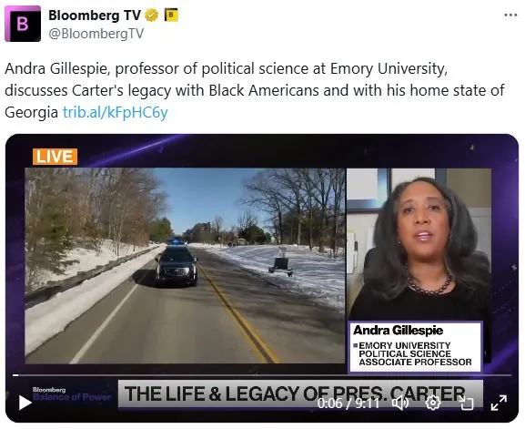 今天在彭博电视台的权力的平衡早间版中,主持人Joe Mathieu和Kailey Leinz采访了埃默里大学政治学教授Andra Gillespie,讨论卡特对乔治亚州的意义以及他在黑人美国人中的遗产,作为对前总统葬礼的特别报道的一部分。