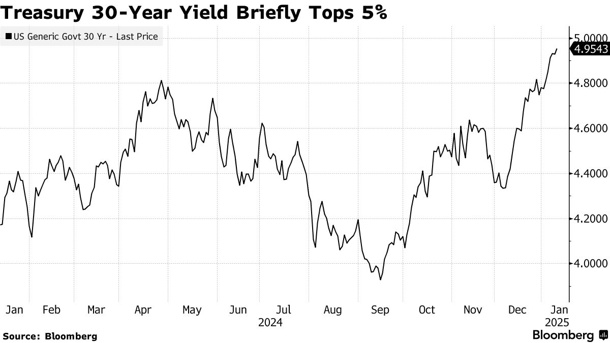 标准普尔500指数周五下跌1.5%,抹去了今年初的涨幅。该指数经历了自12月18日以来最糟糕的暴跌,当时美联储通过发出谨慎信号搅动了市场,表明其在继续降息方面的速度。华尔街风险较高的领域遭到抛售,小型股较之前的高点下跌约10%。国债收益率的下滑一度将 30年期收益率 推高至5%以上。掉期市场现在预计今年美联储降息不到30个基点。