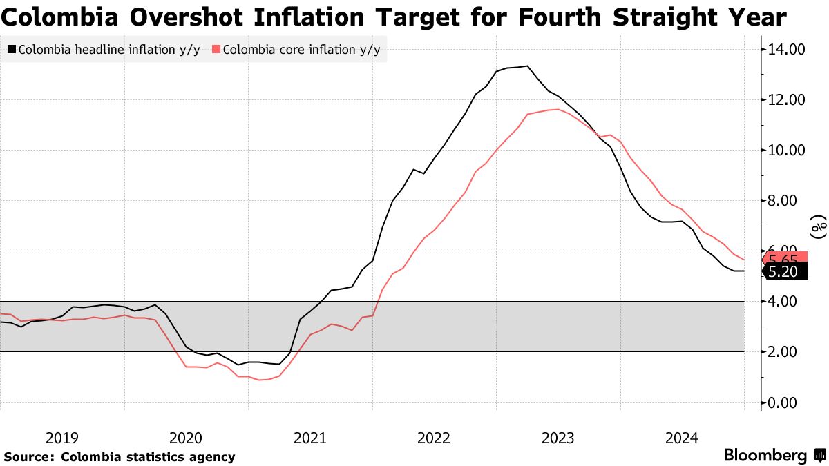 哥伦比亚通胀在2024年结束时为5.2%,高于目标区间的上限 - 彭博社