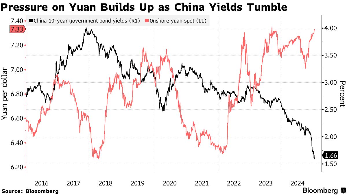 基准债券收益率已跌至历史低点,受到对激进政策宽松以重振疲软经济的押注以及对避险资产的需求的推动。在持续的房地产危机、消费疲软和对通货紧缩的担忧中,投资者转向债券。中国的货币已跌至离岸记录低点。
