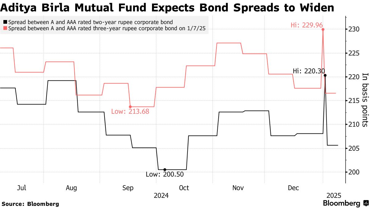 苏奈娜·达库尼哈负责管理超过6500亿卢比(76亿美元)的债务资产,阿迪蒂亚·比尔拉太阳生命资产管理公司,预计未来六个月,评级为AA及以下的卢比票据的利差将进一步扩大,因为在银行贷款放缓的情况下,公司债券供应将增加。