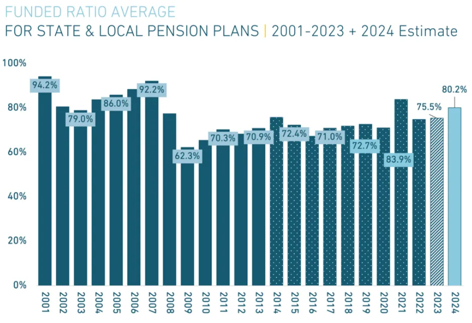 公共部门养老金的状况远不如企业部门。但根据最新的公平研究所报告,州和地方养老金计划因收益率和股本回报的提高而更健康。尽管它们仍然整体上处于赤字状态,就像本世纪的每一年一样,但差距已经缩小。资产略微覆盖超过80%的负债: