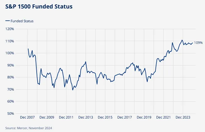 更高的债券收益率 对于任何希望以养老金退休的人来说,都是一个好消息。确定收益养老金依赖于购买为退休人员提供保证收入流的债券。债券越便宜,收益率越高,管理者为养老金支付义务提供资金就越容易。为了让他们的生活更轻松,并降低社会危机的风险,理想的组合是股价上涨和债券收益率上升——这就是过去两年的故事。这是有效的。这是美世对养老金赤字的衡量——资产占负债成本的百分比——针对标准普尔1500指数成员运营的基金: