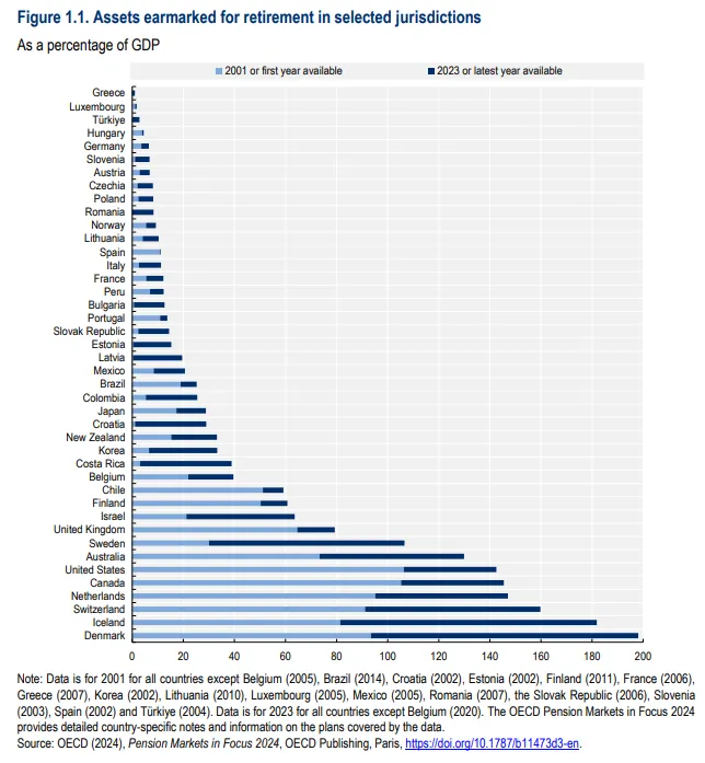 并非所有公共养老金计划都有资产支持。这意味着各国在其国内生产总值中积累的资产比例存在巨大差异。根据经济合作与发展组织的数据,丹麦的养老金资产几乎是其GDP的两倍。对于其他国家来说,它们的资产微不足道。但随着各国政府试图迟来地应对日益增长的寿命和战后婴儿潮一代的退休,几乎所有地方的养老金资产都在增加。减轻养老金的压力使政府的生活更轻松: