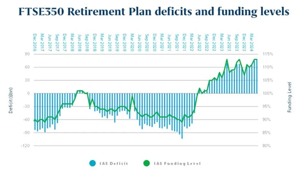 最大的问题是,养老金基金由于受到要求确保能够为养老金领取者提供保障的法规的负担,试图通过承担额外风险来提高回报。监管机构没有掌握他们的行为。因此,令人鼓舞的是,英国公司的养老金基金处于十年来的最佳状态,正如梅赛尔在这里所展示的: