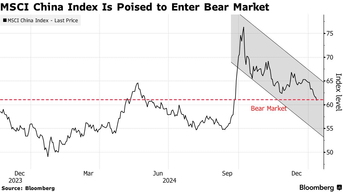 股票在新年伊始遭遇挫折,除了一个交易日外均出现下跌。MSCI中国指数自10月7日收盘以来已暴跌约20%,对经济迅速复苏的希望逐渐消退。