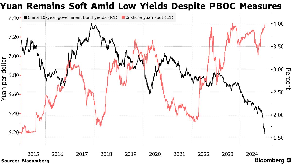 即便在中国人民银行采取连续措施以实现逆转的情况下也是如此。就在本周,中央银行加大了对人民币的支持,通过每日汇率调控,提升了对人民币的需求离岸并表示暂时暂停债券购买。
