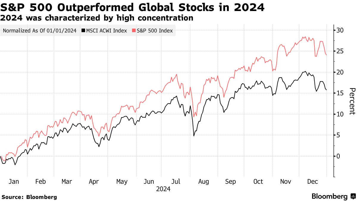 MSCI全球所有国家指数在新年停滞不前,此前自2022年低点以来已上涨超过50%,投资者担心美国可能实施的广泛关税会扰乱全球贸易。欧洲的政治不确定性和中国经济的停滞也对市场情绪造成了压力。