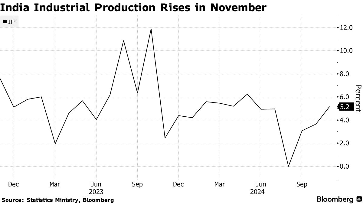 工业生产指数在11月份增长了5.2%,统计部周五表示。这高于彭博社经济学家调查中4.1%的中位数预期,以及10月份修订后的3.7%的数据。