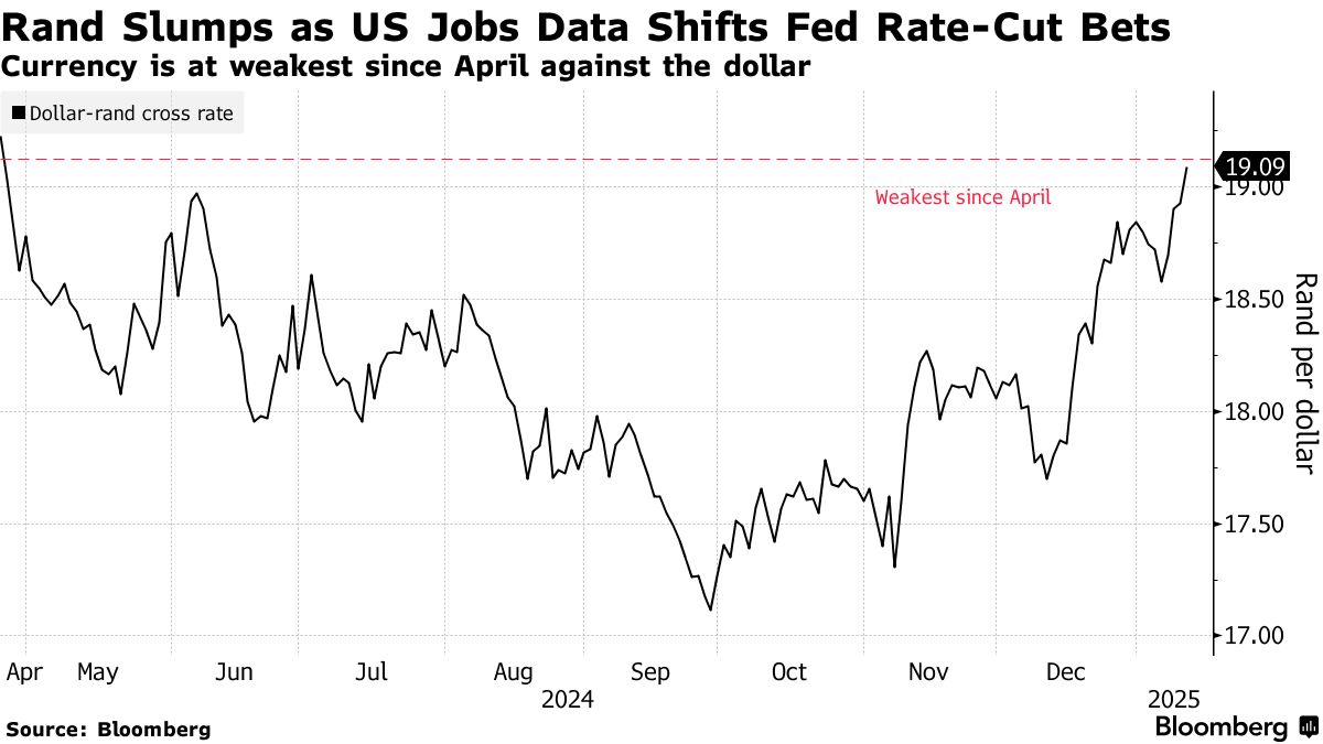 南非兰特(ZAR/USD)在美国就业报告发布后跌至每美元19以上 - 彭博社