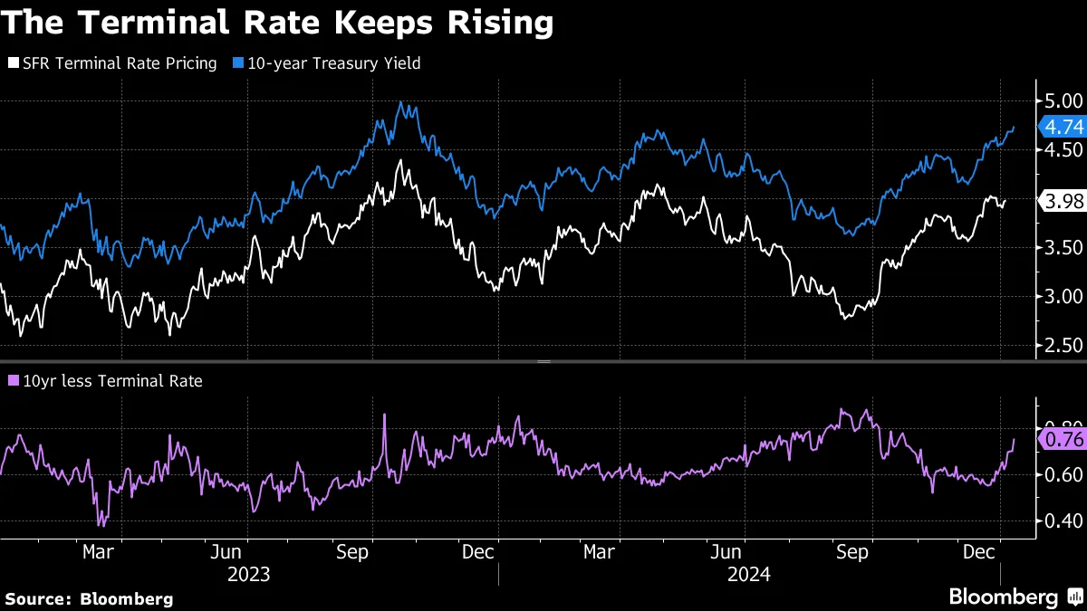 它显示10年期收益率大致与市场对美联储终端利率的预期上升同步(换句话说,就是美联储停止进一步降息的水平)。