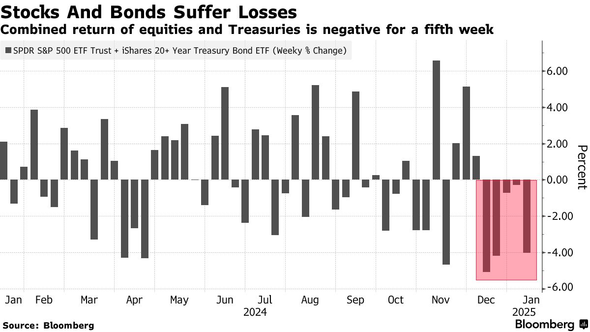 股票和债券的综合回报现在已经连续五周为负,这是自2023年9月以来最长的一段时间,按全球最大的跟踪标准普尔500指数和长期国债的ETF来衡量。这是自2022年以来标准普尔500指数最糟糕的开局——对于所谓的TLT ETF(跟踪长期国债)来说,也是自2021年以来最糟糕的开局。