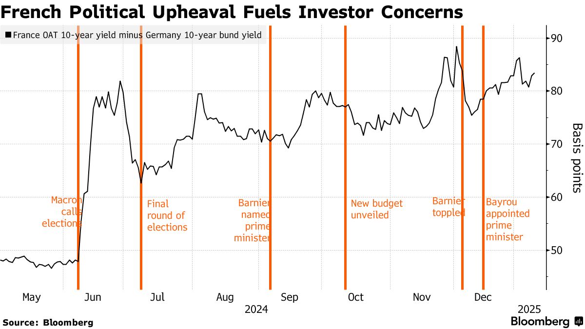 法国的政治和预算困难削弱了投资者信心,推高了借贷成本,使国家依赖紧急立法以避免在议会通过完整预算之前的停摆。