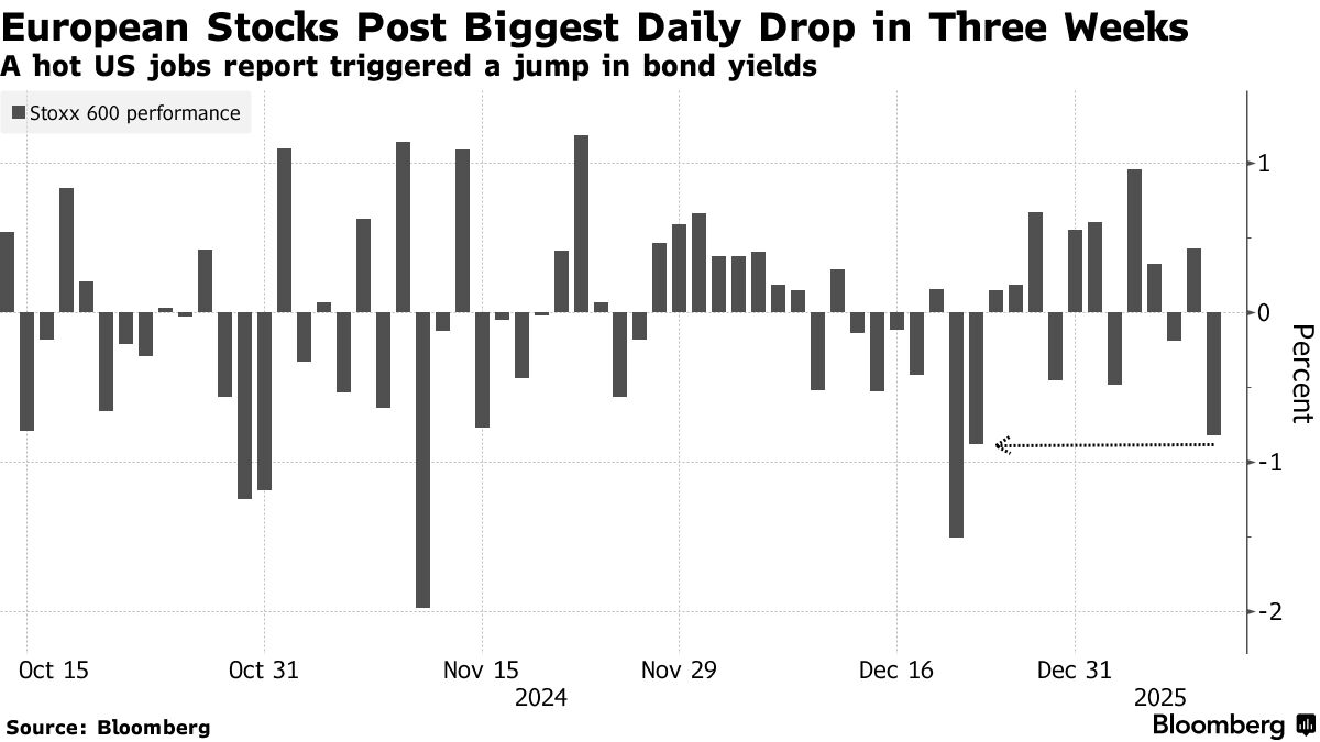 欧洲股市在三周内最大幅度下跌,因为超出预期的美国就业报告引发了人们对美联储将维持较高利率时间更长的担忧。