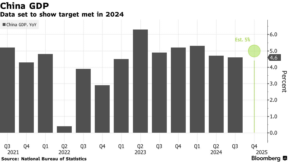 中国在这一周以一系列数据收尾。房价可能继续下滑——尽管可能速度较慢。工业生产可能保持稳定,零售销售在刺激措施的推动下加速增长。国内生产总值预计将显示经济成功实现了“约5%”的2024年年度增长目标,这一点习近平主席在12月底已经宣布。