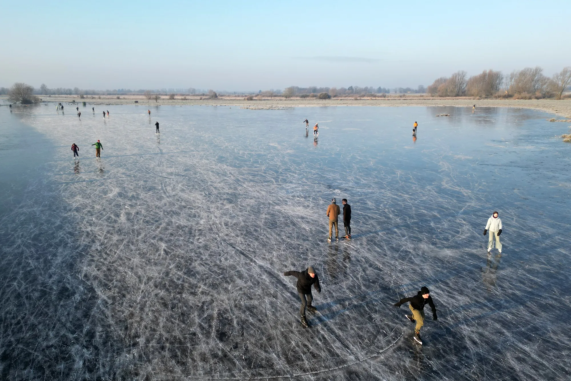 在剑桥郡的乌普韦尔,滑冰者在一个被冰冻的淹没田野上。