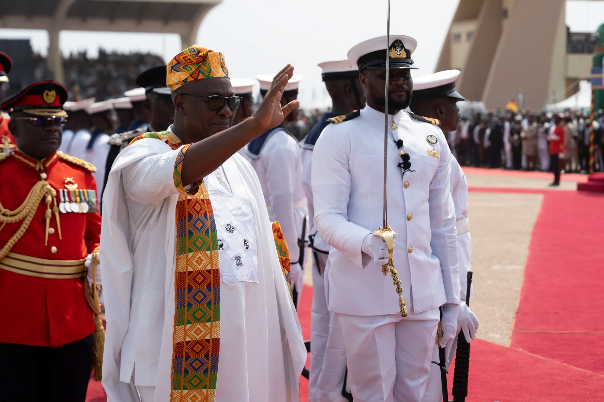 约翰·马哈马在加纳阿克拉独立广场的宣誓仪式上向人群挥手,时间是1月7日。
