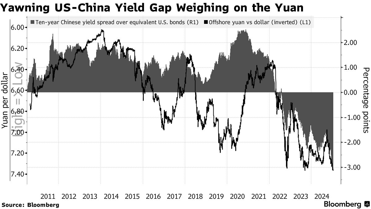 尽管如此,投资者预计,如果当选总统唐纳德·特朗普对中国出口征收更高的关税,中国人民银行最终会允许人民币贬值。在 强劲的美国数据的背景下,美联储对未来降息的谨慎 而中国人民银行预计将进一步放宽政策,这也在施压北京让步。