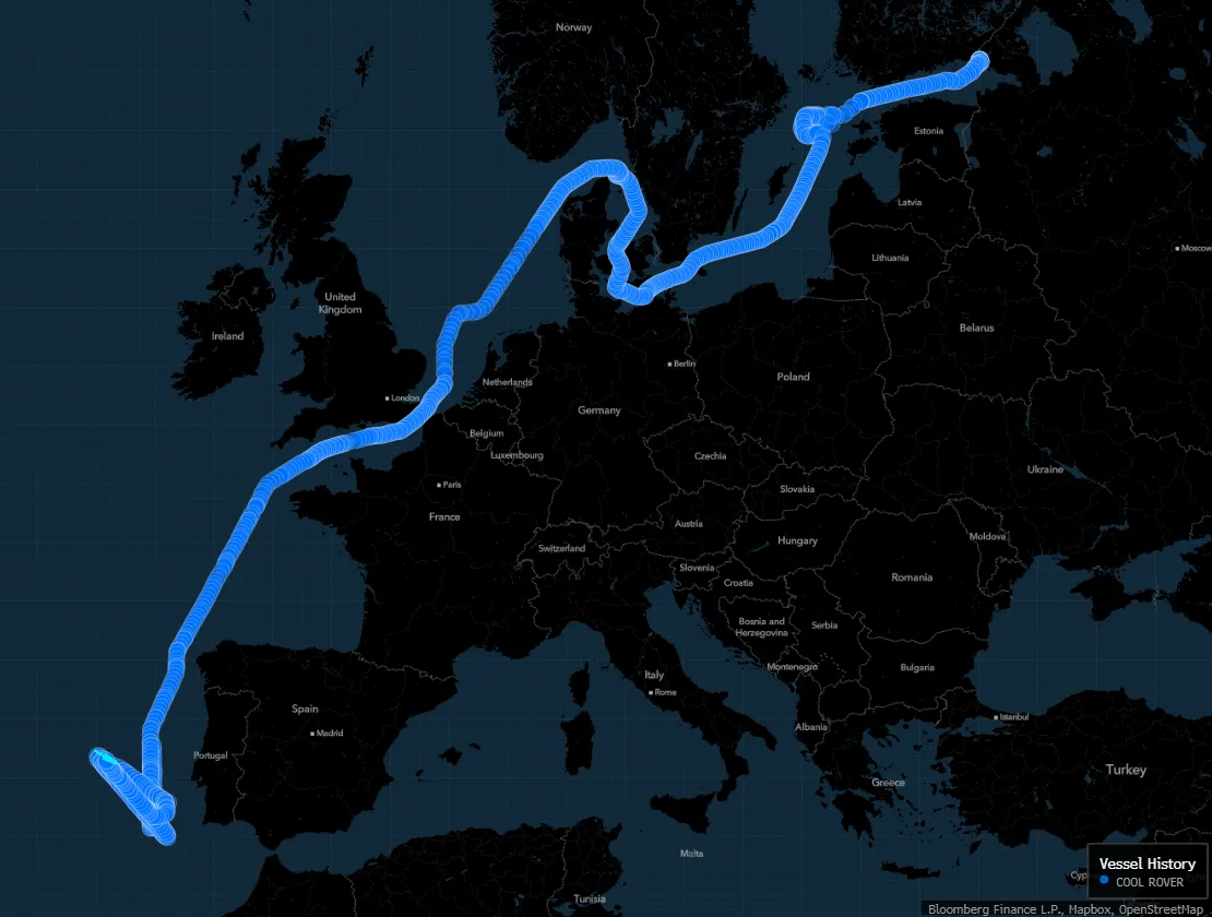 根据彭博社编制的船舶追踪数据,Cool Rover油轮上个月底在俄罗斯天然气工业股份公司的Portovaya液化天然气出口工厂装载,目前在西班牙和葡萄牙沿海闲置。数据显示,该船去年仅向欧洲交付货物。