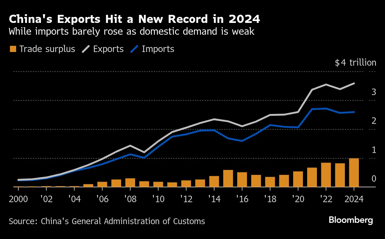 根据海关总署周一发布的声明,2024年的顺差达到了创纪录的9920亿美元。这个数字比前一年增长了21%,主要受到创纪录的出口和疲软的进口推动。