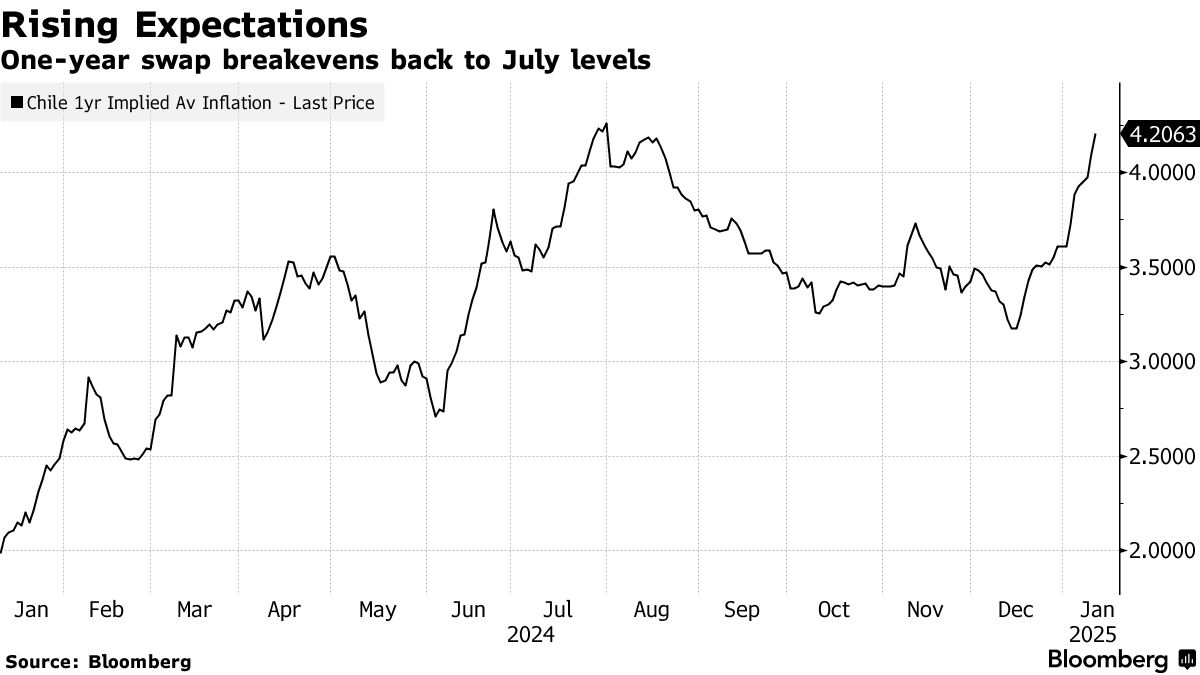 “美联储更加谨慎,正在评估今年的利率暂停以及市场预期唐纳德·特朗普可能采取的措施,这些都影响了全球贸易和通货膨胀,导致智利固定收益率上升,”伊德说。即将于1月20日上任的美国当选总统承诺对各种商品征收关税,并进行大规模驱逐。
