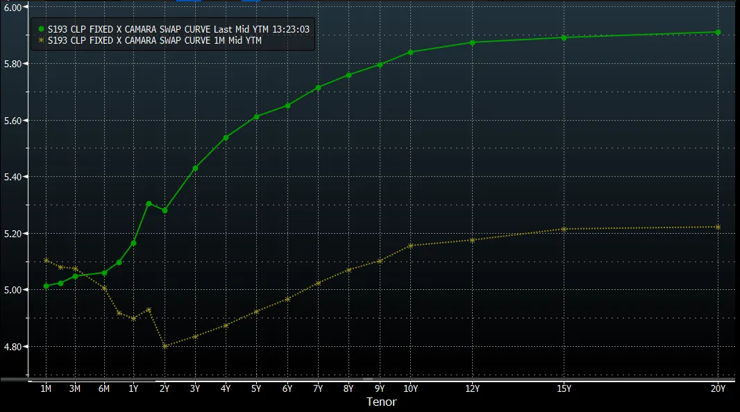 经济学家现在预计,关键利率将在年底降至4.5%,低于当前的5%,周五发布的中央银行调查显示。仅一个月前的预期为4.25%。更重要的是,智利的隐含政策利率从掉期中显示,未来两年的借贷成本为5.75%,比一个月前的预期高出100个基点。